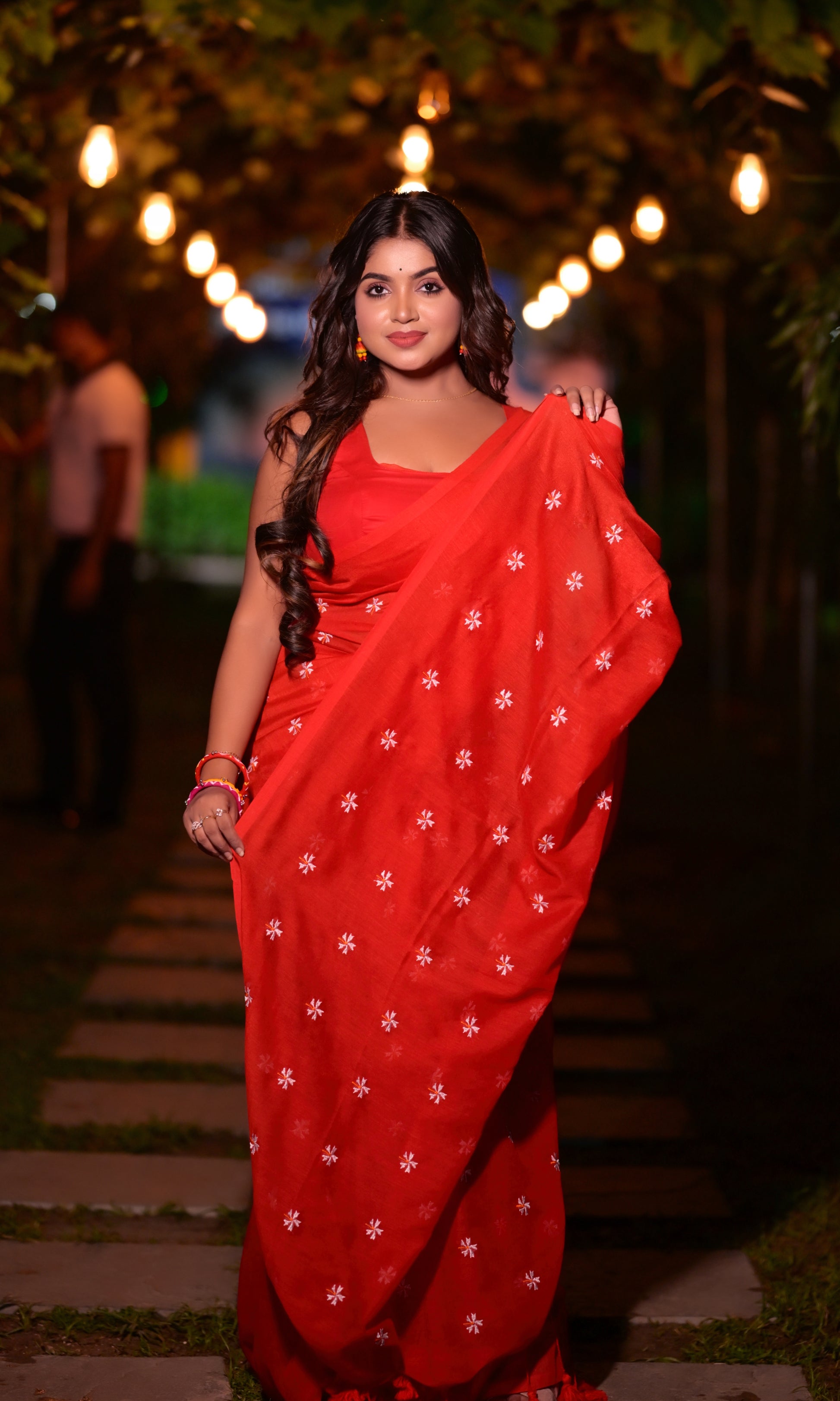 Beautiful Red Khadi Cotton Saree with White Embroidery & Matching Blouse Piece