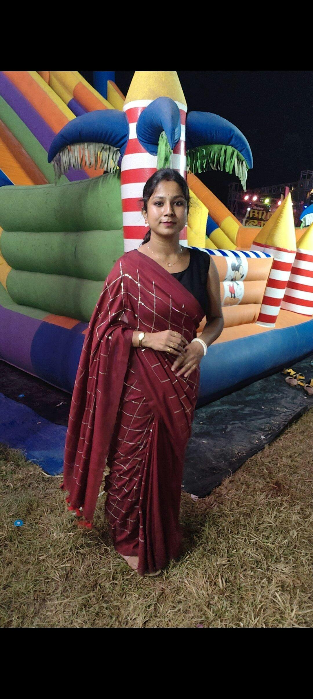 The maroon saree looks absolutely stunning, and the silver detailing adds a touch of elegance. Perfect festive look.