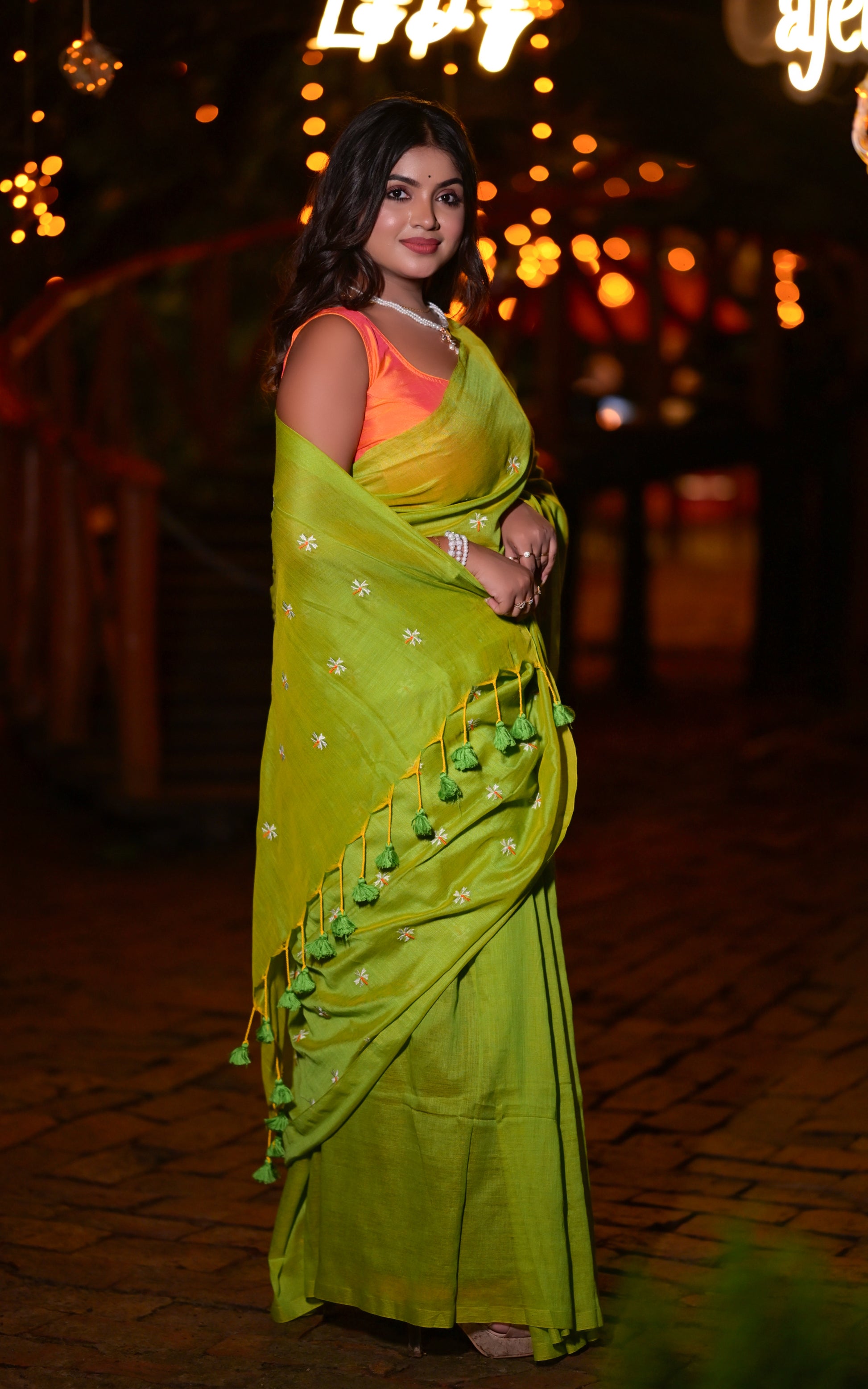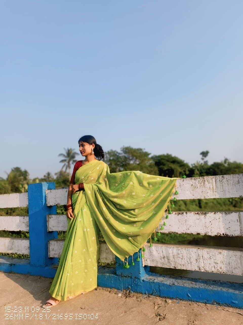 Step into grace and style with this green Khadi cotton saree, beautifully adorned with delicate embroidered floral motifs all over. Crafted from premium Khadi cotton, this saree is lightweight, breathable, and perfect for both daily wear and special occasions. It comes with a matching blouse piece, giving you the complete ethnic look. Ideal for festive functions, office wear, or cultural gatherings, this saree offers timeless elegance with modern charm.