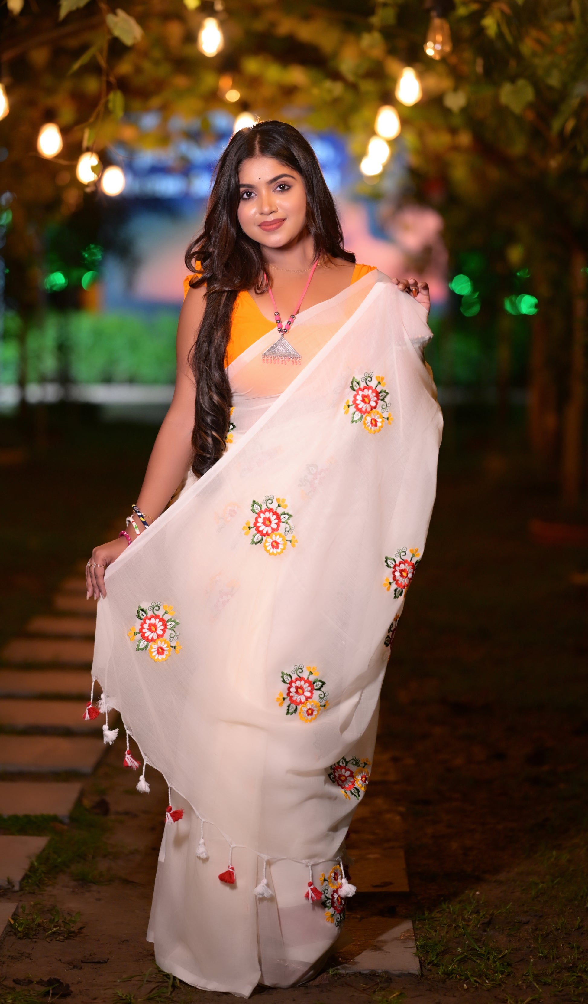 Elegant Off-White Floral Embroidered Mull Cotton Saree (Blouse Not Included)