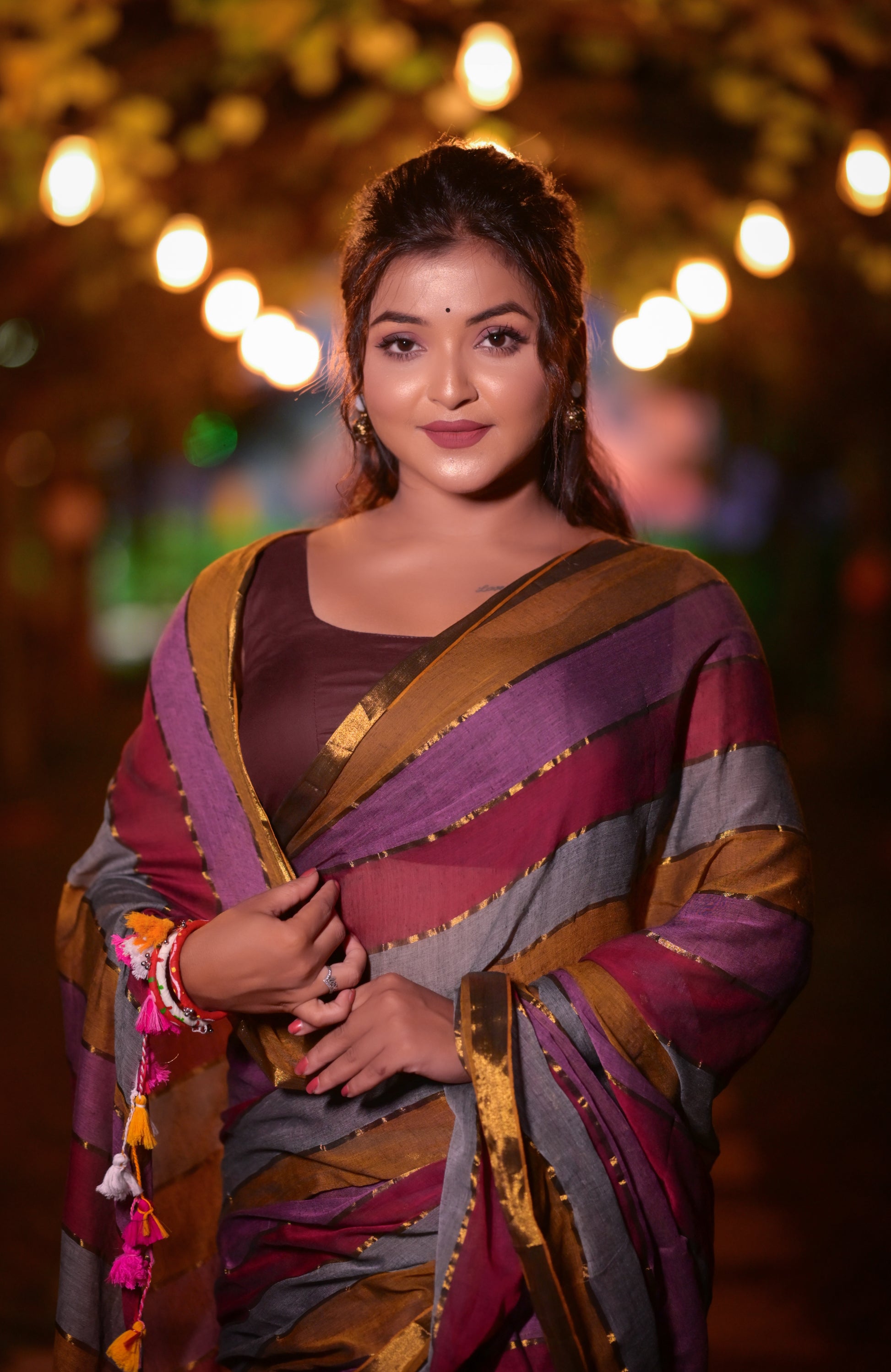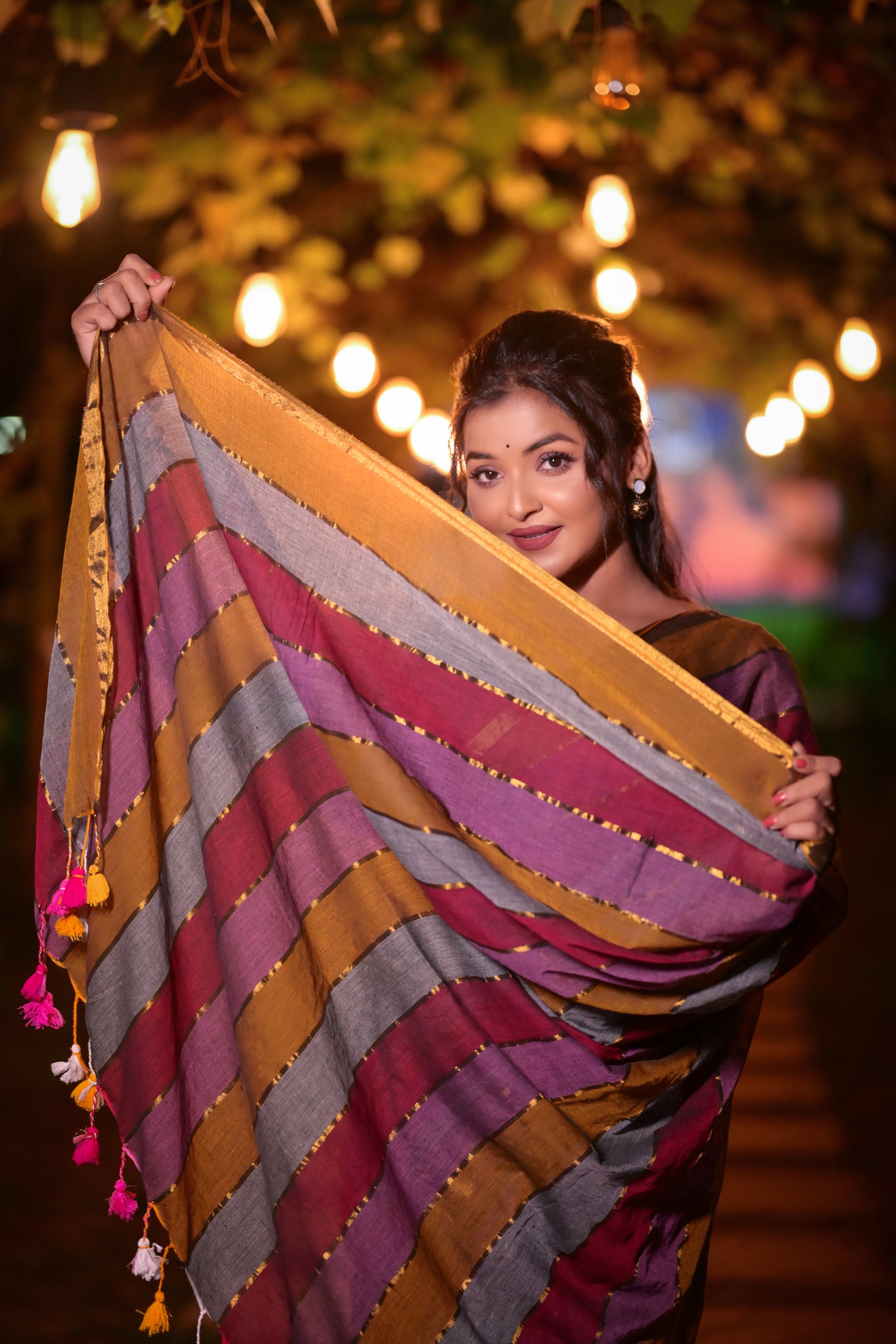 Elevate your ethnic wardrobe with this handwoven mull cotton saree, designed with elegant multicolor stripes in maroon, mustard, and grey, enhanced by a rich golden border. Crafted from premium mull cotton, this saree is soft, breathable, and lightweight, making it perfect for festive occasions, parties, office wear, or daily elegance. It comes with a matching blouse piece for a complete traditional look.