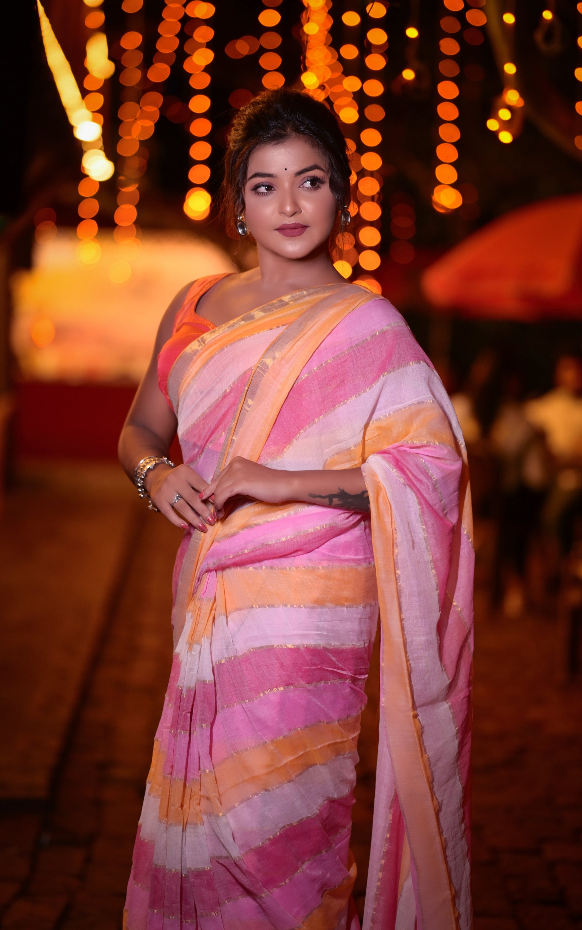 Enhance your ethnic collection with this handwoven mull cotton saree in elegant pink and orange stripes, highlighted with a subtle golden border. Crafted from premium mull cotton, this saree is extremely soft, lightweight, and breathable—perfect for festive occasions, parties, or everyday elegance. It drapes beautifully and comes with a matching blouse piece for a complete traditional look.