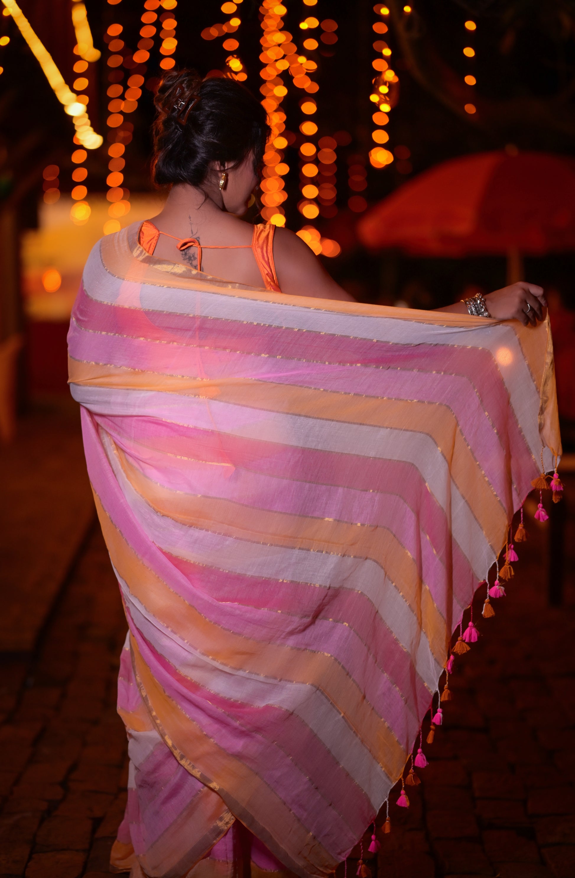 Handwoven Pink & Orange Striped Mull Cotton Saree with Golden Border – Lightweight Festive Wear