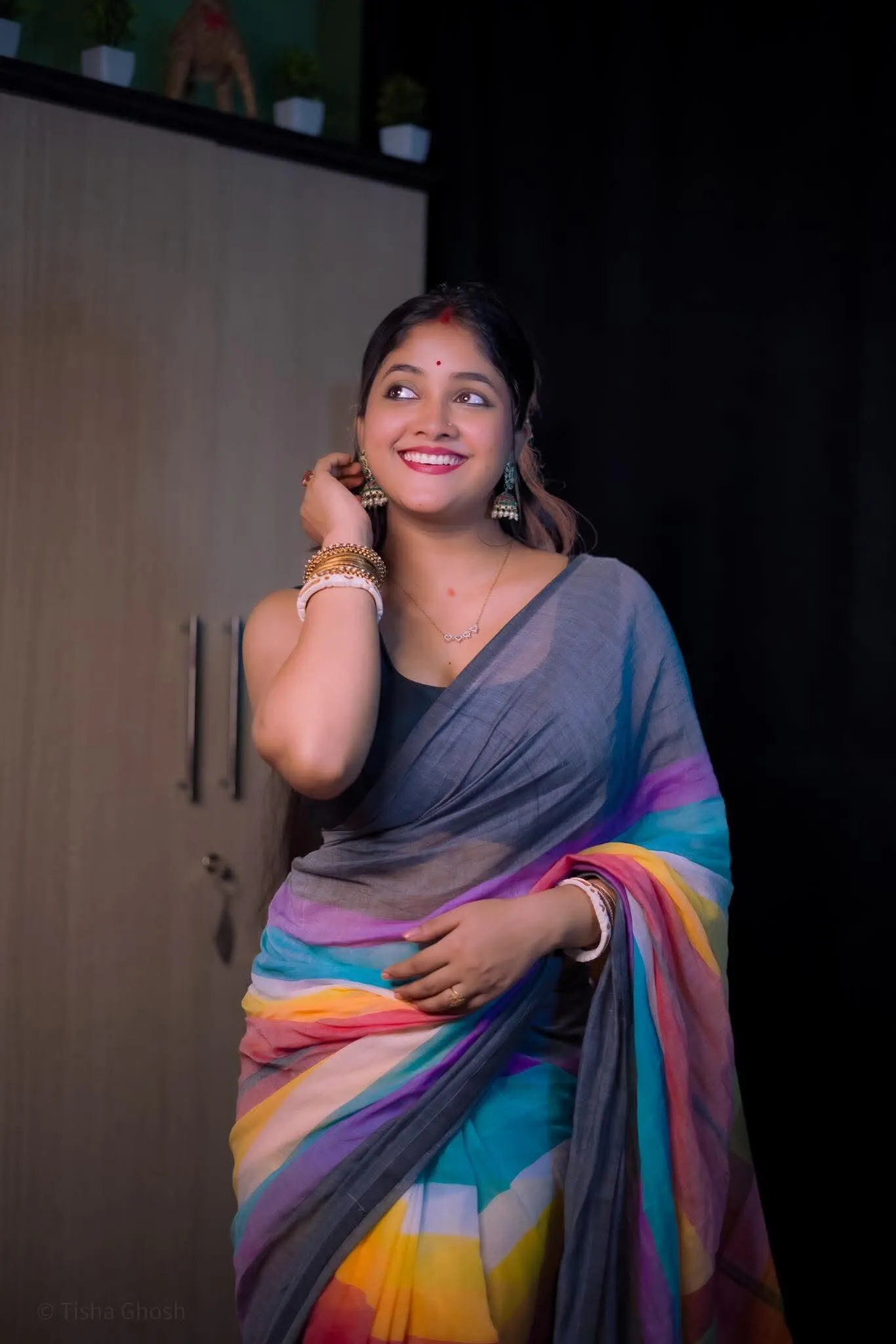 Elevate your ethnic wardrobe with this vibrant mull cotton saree featuring beautiful rainbow-hued stripes and a soft, lightweight drape. The breathable mull cotton fabric makes it perfect for all-day comfort, while the playful multicolor tassel border adds a chic touch. Ideal for festive gatherings, casual outings, or summer wear, this saree blends tradition with a modern flair.