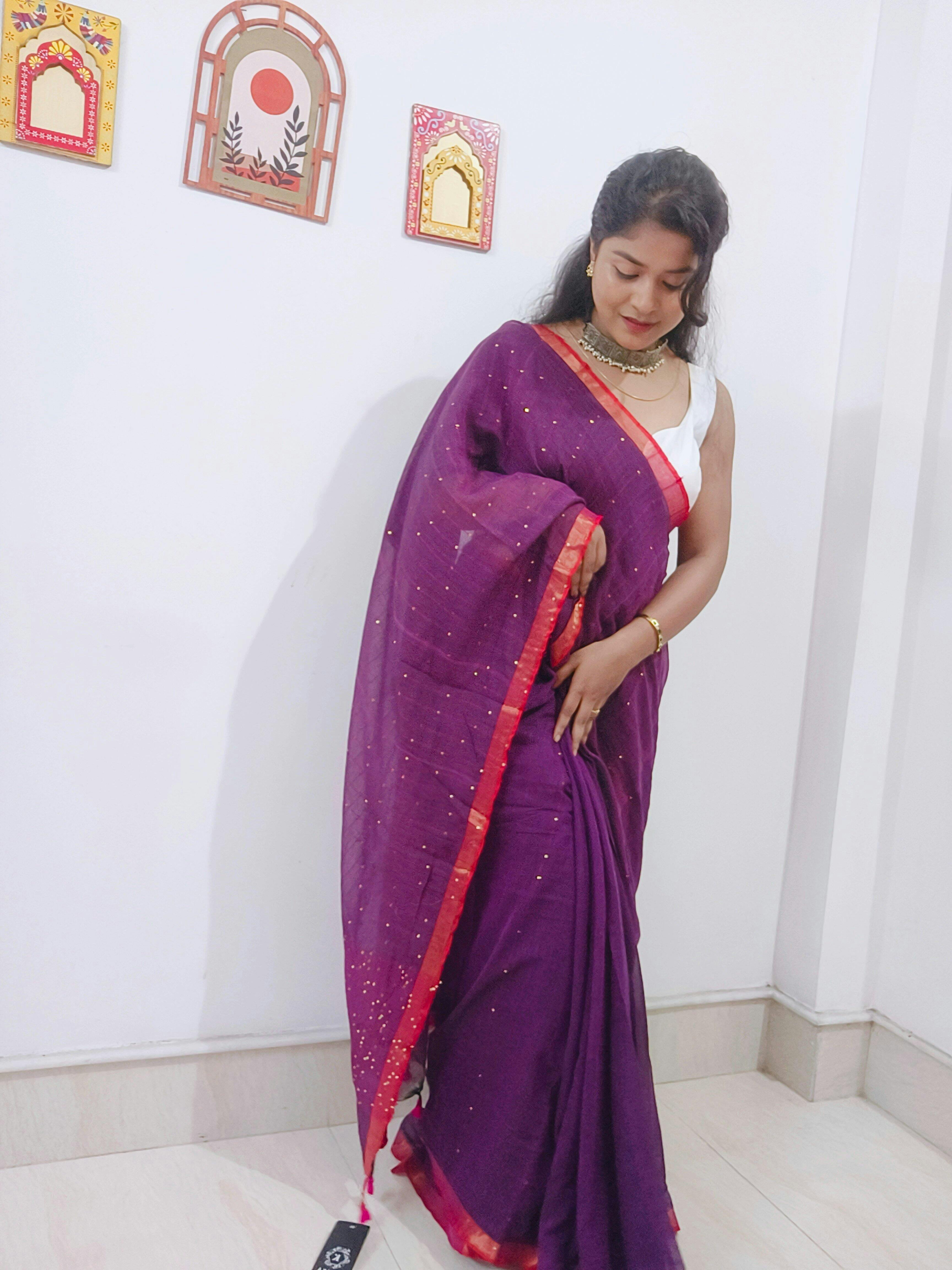 Make a bold style statement with this royal purple mull cotton saree, highlighted by a striking copper-toned border that enhances its regal charm. The soft and breathable mull cotton fabric ensures effortless draping and all-day comfort, while the deep purple shade adds sophistication to your look. This saree comes with a matching blouse piece, making it a complete and versatile addition to your ethnic wardrobe.